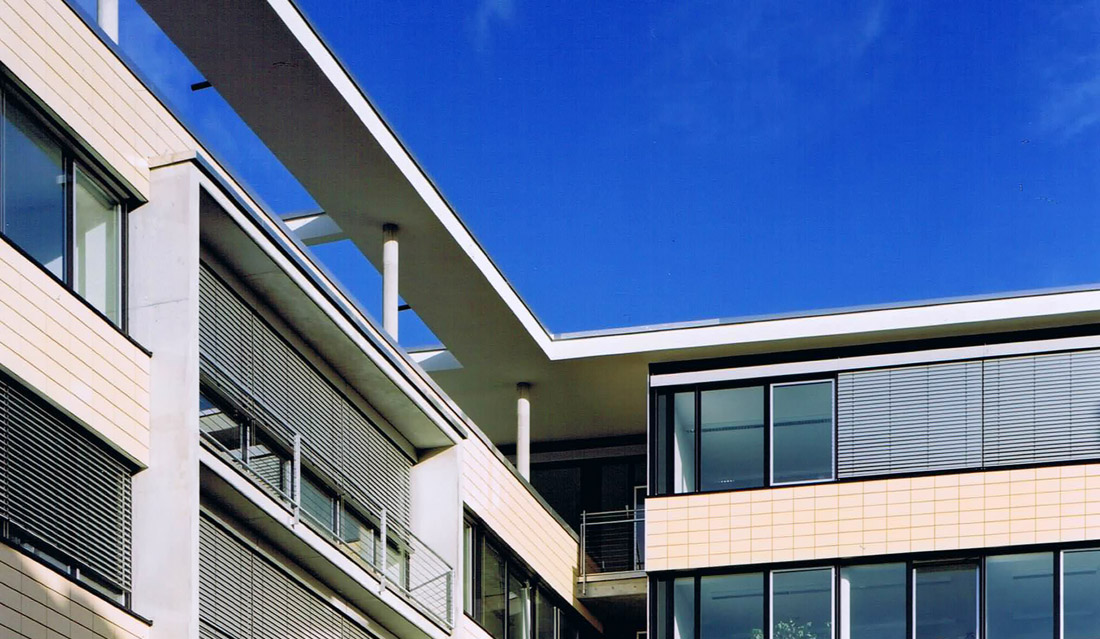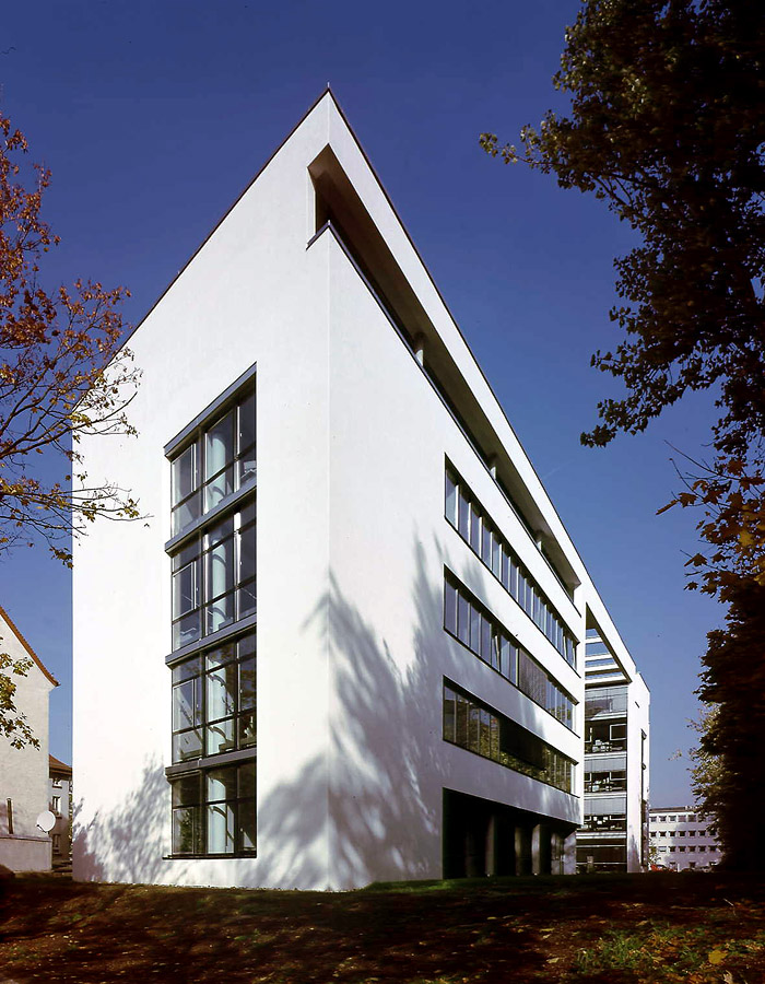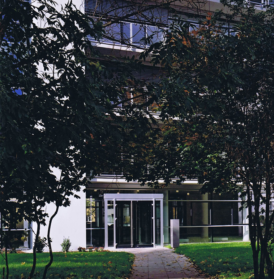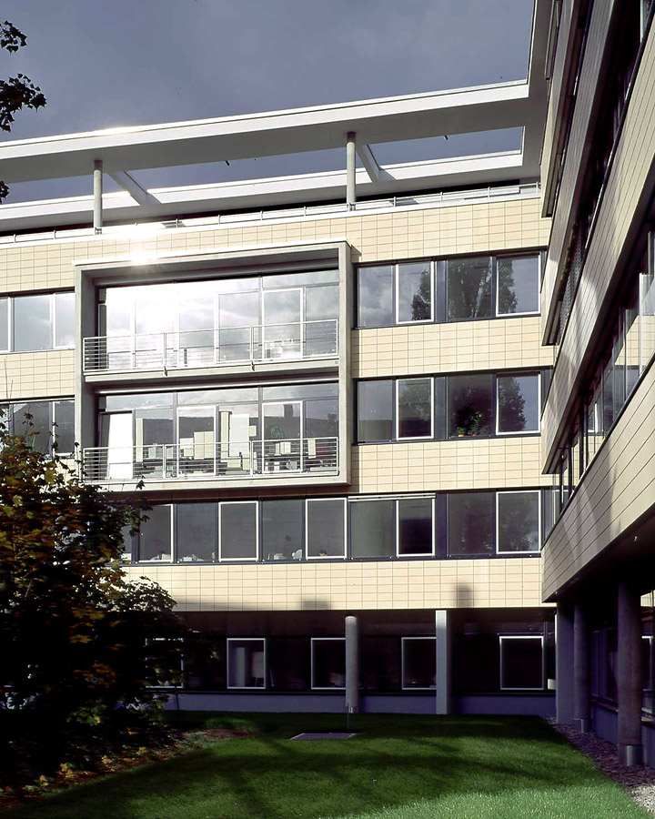 Der L-förmige Baukörper bildet zusammen mit einem bestehenden Wohngebäude eine Art Hof und ist gleichzeitig Auftakt für weitere projektierte Gebäude in einem durchgrünten Büropark.