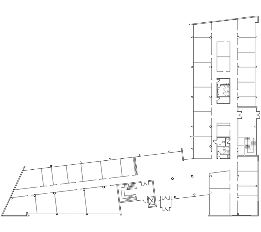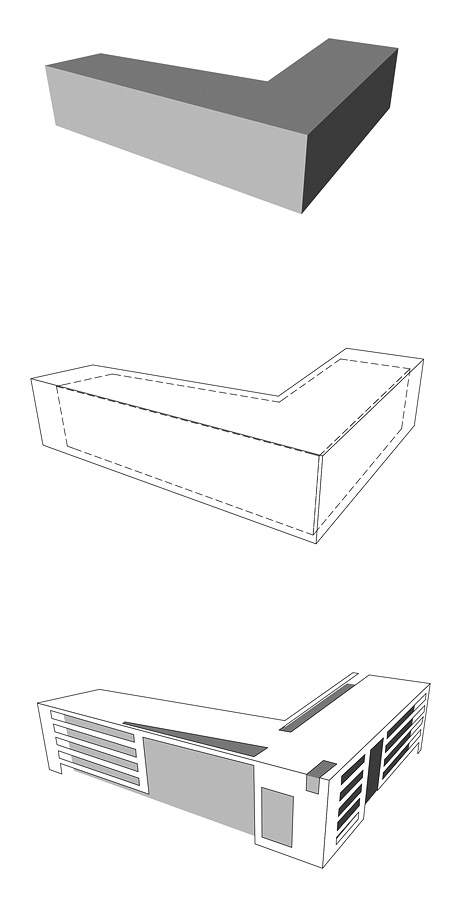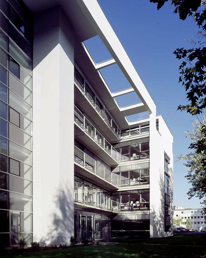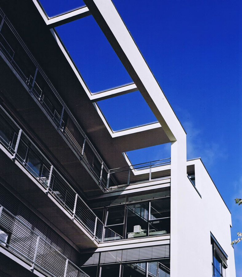 Zentrale Gestaltungsidee ist eine harte, plastische Schale, die an prägnanten Stellen aufgeschnitten wird und das Innenleben des Baukörpers preisgibt. Den größten Einschnitt bildet der Eingangsbereich. Hier erstrecken sich Glasflächen und Stahlbalkone über fünf Etagen. Öffnungen im Dach sorgen für spannenden Lichteinfall auf den Terrassen im Obergeschoss.