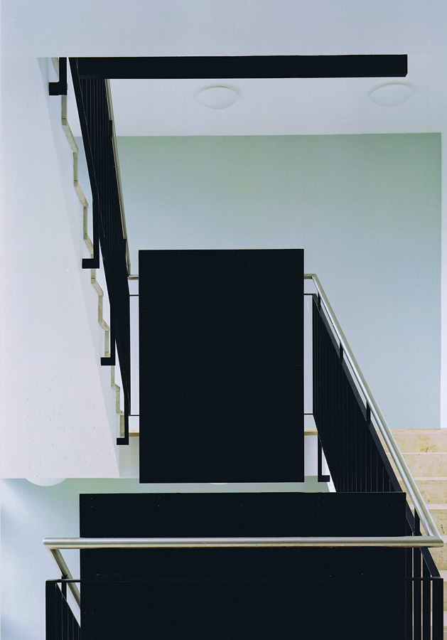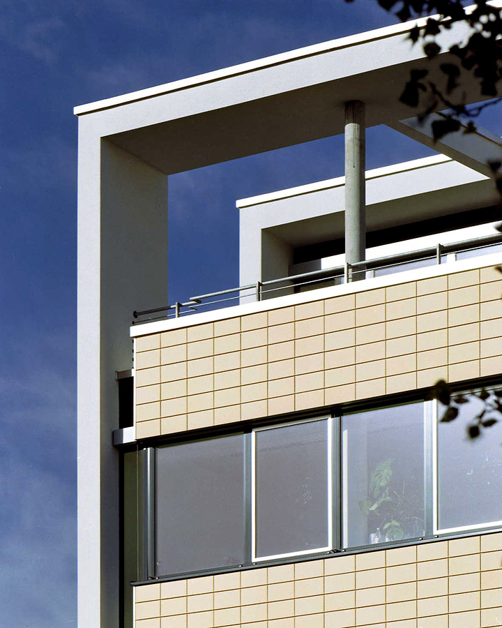 Für die Fassaden zum Hof wurde mit sandfarbenen Keramikplatten ein warmes Material gewählt. Die stärker strukturierten Flächen nähern sich der Nachbarbebauung an. Die schwarzen Fensterbänder und Keramikplatten stehen im Kontrast zur weißen Putzschale.