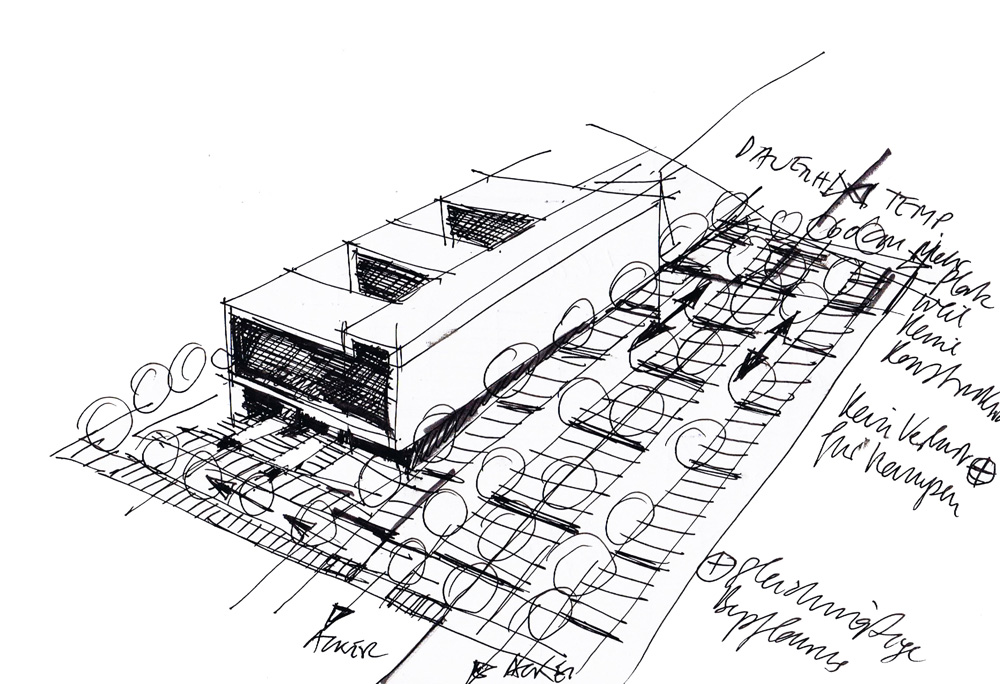 Das Gebäude ist kammartig organisiert und ruht auf einem begrünten Sockel, der Parkdecks mit insgesamt knapp 350 Stellplätzen aufnimmt.