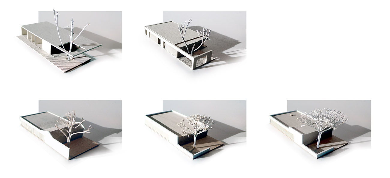 Die Gestaltung des Erweiterungsbaus nimmt sich bewusst zurück und respektiert den Baum als wesentliches, die Atmosphäre prägendes Element. Weiß verputzte Wandflächen umschließen Gebäude und Terrasse. Wenige, großformatige Ausschnitte in diesem „Mantel“ geben den Blick auf Verglasungen und dunkelgrün changierende Paneele frei. Die großzügigen Verglasungen erzeugen helle, lichte Räume.