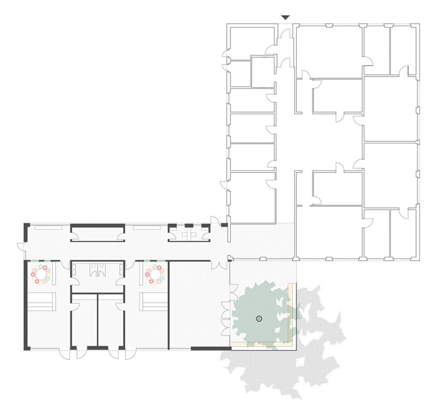 Der Erweiterungsbau schließt als gesonderter Flügel an der Westseite des Bestandsgebäudes an. Seine Positionierung erfolgte mit Rücksicht auf den hier vorhandenen Ahorn, der mit seinem imposanten Wuchs wesentlicher Bezugspunkt der Gartenanlage ist. So wird er zum Mittelpunkt der neu gestalteten Terrasse, die sich als räumliche Erweiterung fließend aus dem neuen Mehrzweckraum entwickelt und als Gelenk zwischen Bestandsbau und Erweiterung wirkt.