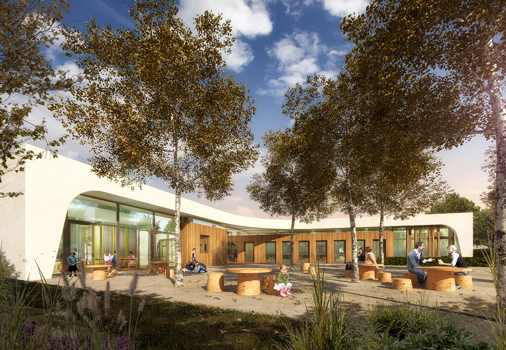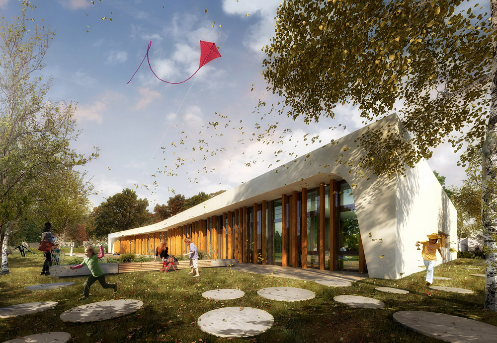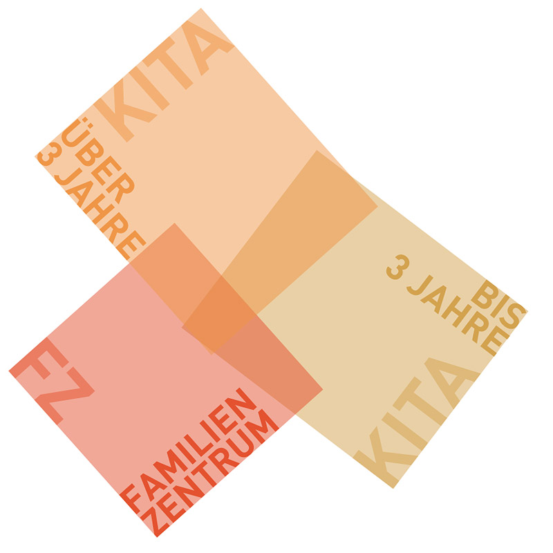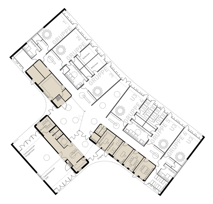 Der Grundriss wurde mit der Anmutung eines dreiflügeligen Propellers entwickelt. Die zwei langen Flügel nehmen die Kita auf, der dritte, quer liegende, das Familienzentrum. Den unterschiedlichen Funktionsbereichen sind als räumliche Erweiterung jeweils eigene, großzügig begrünte Außenbereiche zugeordnet.